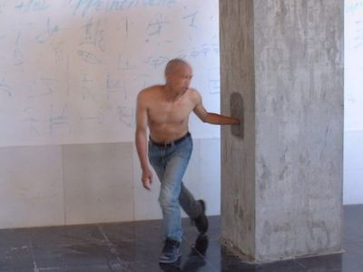 In October, 2003, He Yunchang interpreted Weisheng’s story as a work of performance entitled Keeping Promise in Lijiang, Yunnan. For 24 hours, he kept his left hand in concrete, and as it solidifed attained a solemn sculptural presence with it. He had written on a wall behind him the original text from the Miscellaneous Chapters in English, Chinese, and the script of the Dongba minority of Yunnan, seeming to invite us to consider the differences between representations of the story in different languages, including his own performance.
